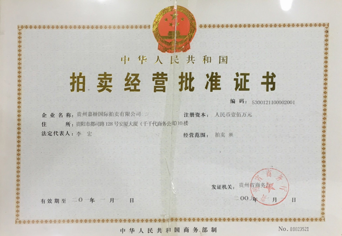 貴州嘉棰國際拍賣有限公司是主要從事動產、不動產、無形資產和文物藝術品拍賣業務的大型綜合性拍賣企業,是中國拍賣行業協會會員,貴州省拍賣行業協會理事單位,中國拍賣行業協會AA級資質企業,貴州省連續十一年重合同守信用企業,全省拍賣先進企業,貴州省公物拍賣人。公司充分利用多年來積累的客戶資源和全新的經營理念服務于貴州經濟發展。同時也為貴州省國有企業的資產重組、改制改造以及不良資產的變現,起到積極的作用。貴州嘉棰國際拍賣有限公司自成立以來,多次成功地組織了房產、土地、機器設備和各種物資等標的拍賣。并于2001年12月成為第一批貴州省高級人民法院及多家金融機構指定的拍賣企業。 公司下設產權部、市場發展部、財務部、人事部和辦公室?,F有員工11名,大專以上學歷員工占總數的90%,擁有精通業務的專門人才。有國家注冊拍賣師3名,公司工作人員大多參加過中國拍賣行業協會組織的從業資格培訓。公司堅持“客戶至上,執業嚴謹,公平競.....